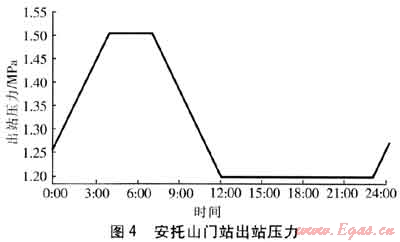 根據(jù)統(tǒng)計(jì)的歷史數(shù)據(jù),預(yù)測供氣期間最大用氣日24h各用氣點(diǎn)的用氣情況,比選的方案均按相同的用氣情況。調(diào)度方案1、2中,坪山門站的出站壓力設(shè)為定值1.5MPa,安托山門站的出站壓力按圖4調(diào)整。