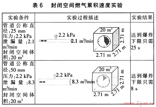 從表6不難看出,燃?xì)庑孤┖笤诜忾]空間的累積速度非常快,這就意味著在封閉空間燃?xì)庑孤┓浅NkU(xiǎn)。