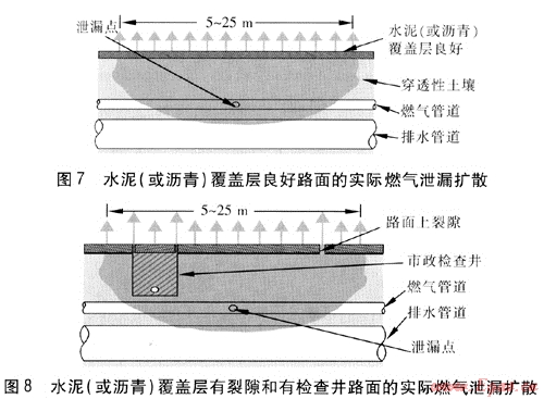 圖7為水泥(或?yàn)r青)覆蓋層良好路面的實(shí)際燃?xì)庑孤U(kuò)散[6、7]。圖8為水泥(或?yàn)r青)覆蓋層有裂隙和有檢查井路面的實(shí)際燃?xì)庑孤U(kuò)散[8]。
