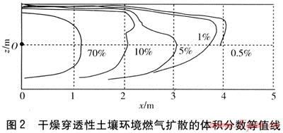 圖1為干燥天氣下穿透性土壤環(huán)境燃?xì)鈹U(kuò)散的體積分?jǐn)?shù)等值線。圖中原點(diǎn)0為泄漏點(diǎn)(以下各圖同)。