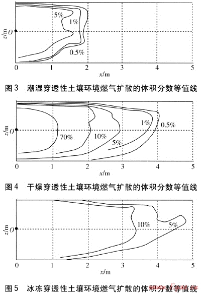 圖4為干燥穿透性土壤環(huán)境燃?xì)鈹U(kuò)散的體積分?jǐn)?shù)等值線,圖5為冰凍穿透性土壤環(huán)境燃?xì)鈹U(kuò)散的體積分?jǐn)?shù)等值線。