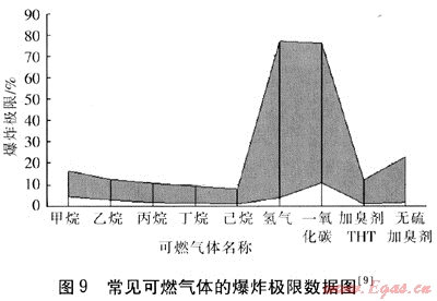 由于可燃?xì)怏w種類很多而性質(zhì)差異很大,為統(tǒng)一地描述其爆炸特性,通常采用爆炸極限這一參數(shù)。特別需要指出的是,某種可燃?xì)怏w的爆炸極限的值是通過(guò)實(shí)驗(yàn)得到的客觀恒定值。圖9是常見(jiàn)可燃?xì)怏w的爆炸極限數(shù)據(jù)圖[9],表5是常見(jiàn)可燃?xì)怏w的爆炸極限數(shù)據(jù)表[9]。