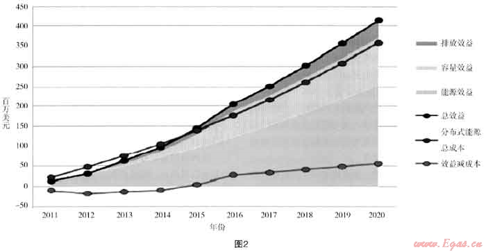 圖2中表示在2011到2014年的最初幾年DER的成本大于效益,但2015年以后效益大于成本。在最初幾年DER總量較小,其潛在的優(yōu)勢,包括財政優(yōu)惠的作用都未能充分顯現出來,但2014年后隨著DER容量加大的規(guī)模效益和政策、市場、技術的發(fā)展,效益逐步超過了成本。