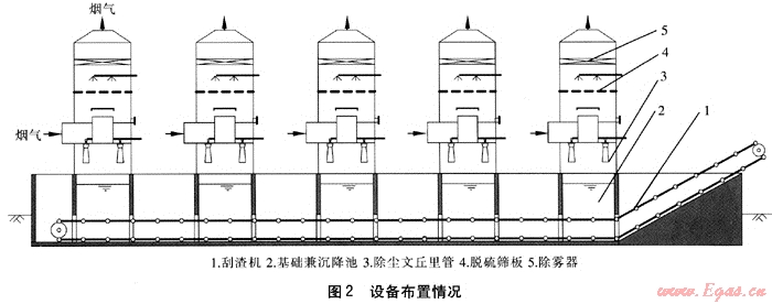 脫硫除塵裝置安裝在原除塵器的位置,底部基礎(chǔ)兼做沉降池,在池底安裝刮渣機(jī),5臺雙循環(huán)煙氣脫硫除塵裝置基礎(chǔ)連通,共用一臺刮渣機(jī),沉降的灰渣經(jīng)刮渣機(jī)的框鏈集中運輸?shù)交覉觥kp循環(huán)脫硫除塵裝置總阻力比原除塵器僅增加500Pa,因此可保留原引風(fēng)機(jī)。增加一個除塵水循環(huán)池和一個堿液循環(huán)池,除塵水循環(huán)池與沉降池連通,除塵水循環(huán)泵將除塵水通過噴頭送入文丘里管與煙氣混合,在喉口處煙塵與液滴充分混合,煙塵被加濕?;咚倭鞒鑫那鹄锕芎鬀_擊液面,被液面捕集,灰渣沉降于池底被刮渣機(jī)清除,清液流回除塵水循環(huán)池循環(huán)使用。堿液循環(huán)泵將堿液送入脫硫塔,在篩板上與除塵后的煙氣混合形成流化床,煙氣中的二氧化硫被吸收,脫硫后的煙氣經(jīng)除霧器脫水后排出,脫硫后的堿液經(jīng)排液口流回堿液循環(huán)池調(diào)整pH值后循環(huán)使用。設(shè)備外部堿液循環(huán)管道和除塵水循環(huán)管道均采用UPVC工程塑料管。