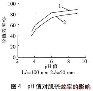 脫硫劑pH值是影響脫硫效率的一個重要參數(shù),也是脫硫過程中可調(diào)的參數(shù)。選擇適當?shù)膒H值,不僅能夠保證足夠高的脫硫效率,還可以降低運行成本,保證脫硫系統(tǒng)的穩(wěn)定運行。實驗選擇的石灰脫硫劑體積分數(shù)為10%;h為高液位溢流管管口距沖擊管出口的距離,分別取50、100mm;低液位溢流管管口距沖擊管出口的距離為20mm。脫硫劑pH值對脫硫效率的影響見圖4。由圖4可知,脫硫劑pH值為3.8~6.0時,脫硫效率隨pH值的增加變化較快;pH值>6時,脫硫效率變化緩慢。h=100mm時,噴射速度提高,引射的液量增加,鼓泡通過液層的高度和運動的距離增加,氣液交換的時間延長,脫硫效率較高,阻力隨之增大。