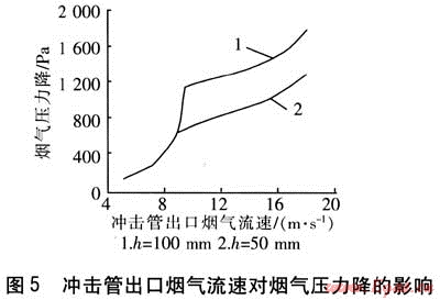 沖擊管出口煙氣流速對煙氣壓力降的影響見圖5。由圖5可知,當h=50mm、沖擊管出口煙氣流速為5.0~8.4m/s時,液位由低液位溢流管控制,氣體通過沖擊管出口與液位高度為20mm的空間發(fā)生氣體卷吸液體的現(xiàn)象。隨著流速的增大卷吸現(xiàn)象加劇,被卷吸的液體量增加,氣液接觸主要在上升通道內(nèi)進行,氣體壓降隨流速增加。當沖擊管出口煙氣流速超過8.4m/s時,液位開始下降,低液位溢流管失效,沖擊管出口與液位形成的空間變大,上升通道內(nèi)煙氣流速迅速提高,動壓加大、靜壓減小,套管兩側(cè)形成壓力差,套管外側(cè)液體通過排孔流入上升通道與上升氣流混合。下降氣流在此空間轉(zhuǎn)向流動,速度滯流動壓轉(zhuǎn)化為靜壓,在排孔兩側(cè)形成壓力差,煙氣通過排孔進入液相形成鼓泡。當沖擊管出口流速為18m/s時,煙氣壓力降為1300Pa。