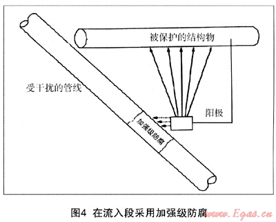 對(duì)于雜散電流腐蝕的防護(hù),人們有個(gè)誤區(qū),往往會(huì)在流出段采用加強(qiáng)級(jí)防腐,因?yàn)檫@里的管道正在被腐蝕。這樣做的結(jié)果只是腐蝕區(qū)域的前后轉(zhuǎn)移,而無(wú)法避免腐蝕的發(fā)生,因?yàn)榱魅氲碾娏骺偸且鞒龅摹?duì)于舊管道維修,由于通常只修補(bǔ)大的破損點(diǎn),使得腐蝕電流更集中在未修補(bǔ)的小破損點(diǎn)處,形成“大陰極小陽(yáng)極”的嚴(yán)重腐蝕局面,反而加快了穿孔的速度。正確的做法是,要在流入段(靠近其他被保護(hù)構(gòu)筑物的輔助地床處)采用加強(qiáng)級(jí)防腐,盡力避免雜散電流的流入(圖4)。