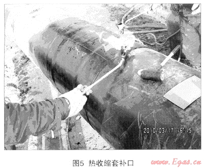熱收縮套結(jié)構(gòu)與膠粘帶類似,但聚乙烯背材為輻射交聯(lián)后拉伸定型的,膠粘劑是熱熔膠,而非壓敏膠。在現(xiàn)場(chǎng)將之松松地套在焊口上,用火焰烘烤外側(cè)時(shí),背材會(huì)緊密地收縮包覆在鋼管上,內(nèi)層膠粘劑會(huì)熔化填充所有空隙,與管體防腐層一同構(gòu)成連續(xù)的防腐結(jié)構(gòu)(圖5)。