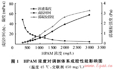 由圖1可見,聚合物濃度增加,體系成膠時間縮短。同時形成的弱凝膠強度隨著HPAM濃度的增加而增強。但當HPAM濃度大于2000mg/L時,雖然凝膠強度增加到1Pa以上(按凝膠強弱分級為較強凝膠),但成膠時間縮短到10h以下,這在大劑量深部處理時易導致前期調剖劑段塞反應太快而使后面的調剖劑注入困難。此外,HPAM濃度越高,調剖體系溶液越黏稠,配制及注入都相對要困難些。在弱凝膠強度及性能滿足作業(yè)要求條件下,低濃度可獲得較低的成本。但濃度不能低于400mg/L,因為HPAM濃度在400mg/L以下時弱凝膠強度很弱,穩(wěn)定1~2周后有少量的游離水,但弱凝膠HPAM濃度在500mg/L以上時,形成的弱凝膠性能則穩(wěn)定。