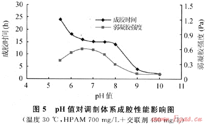 在HPAM/Cr3+交聯體系中,pH值對體系溶液是否成膠有著決定性的影響,對HPAM—YG102-3交聯體系成膠性能影響實驗結果見表1、圖5。