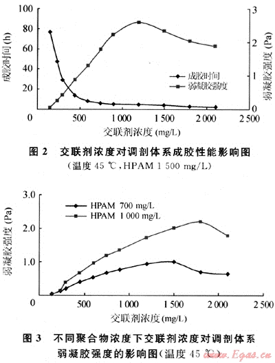 由圖2、圖3可見,聚合物濃度一定時,交聯劑濃度增加,體系成膠時間縮短,形成的弱凝膠強度增加,這是因為交聯劑濃度增加,聚合物交聯機會及弱凝膠分子間交聯密度增加所致。但交聯劑濃度過高時,體系形成的弱凝膠反而有所降低,長期放置觀測發(fā)現弱凝膠不穩(wěn)定,有輕微脫水現象。這是因為交聯劑濃度過高,體系反應形成凝膠后,溶液內部的活性基團與交聯劑之間的化學反應仍在進行,這會使凝膠的交聯點增加,交聯密度增大導致凝膠的分子線團發(fā)生收縮,從而出現脫水和破膠現象。同時交聯劑濃度太小時,體系交聯不充分或不能有效地進行交聯,形成的凝膠太弱或不能形成整體凝膠,用于調剖難以形成有效的堵塞。此外聚合物濃度越高,形成穩(wěn)定弱凝膠要求的交聯劑也相應增加。用于裂縫凝析氣藏調剖作業(yè)的弱凝膠,一般要求弱凝膠強度稍高,在1Pa以上。HPAM在1000mg/L以上,調剖劑最佳交聯劑濃度確定在450~900mg/L,該調剖體系形成的弱凝膠穩(wěn)定,弱凝膠在地層中可移動,從而達到調剖目的。