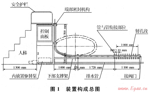 為了能進(jìn)行連續(xù)油管在水平井井筒中對替液、沖砂、孔眼分流等模擬研究,預(yù)期研制成的模擬裝置能達(dá)到以下主要功能:①能模擬川渝氣區(qū)主要水平井的井眼特征;②能模擬工作液在連續(xù)油管入井后的流動(dòng)狀態(tài),并具有可視化功能,便于觀察和拍攝;③能開展連續(xù)油管作業(yè)時(shí),工作液的孔眼分流模擬實(shí)驗(yàn);④能開展運(yùn)用連續(xù)油管進(jìn)行替液、沖砂、攜砂等模擬實(shí)驗(yàn)研究[1~3]。