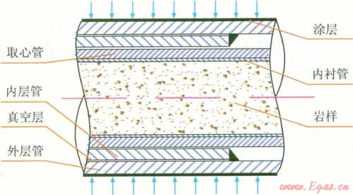 系統(tǒng)保溫筒設(shè)計(jì)如圖2,采用超高真空絕熱方式,在內(nèi)層管、外層管間抽真空;高真空層內(nèi)外表面噴涂等離子隔熱材料;外層管表面涂防陽(yáng)光輻射涂料;在取心筒外面直接用保溫材料實(shí)施保溫。保溫結(jié)構(gòu)設(shè)計(jì)簡(jiǎn)單,現(xiàn)場(chǎng)可操作性強(qiáng),使用方便。