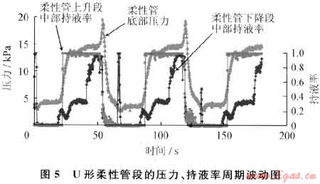 圖5是氣、液相折算速度都為0.30m/s時(shí)U形柔性管的壓力、持液率周期波動(dòng)圖。在液塞形成階段液塞頭進(jìn)入U(xiǎn)形柔性管之前,U形柔性管內(nèi)少量液體振蕩流動(dòng),U形柔性管底部壓力較小并有小幅度的波動(dòng)。液塞進(jìn)入U(xiǎn)形柔性管后,U形柔性管下降段中部持液率先開始上升,由于下降段傾角較大,液體在下降段為分層流,U形柔性管下降段中部持液率值較小。隨著液塞頭在上升段中生長,U形柔性管底部壓力開始增大,當(dāng)?shù)竭_(dá)上升管探針處時(shí),U形柔性管上升段中部持液率從0變?yōu)?。在液塞生產(chǎn)階段,U形柔性管底部壓力與U形柔性管上升段中部持液率不再增長。隨著液塞不斷流入U(xiǎn)形柔性管,U形柔性管上升段中部持液率慢慢增大。在液氣噴發(fā)階段,由于液塞加速,U形柔性管底部壓力先迅速增大然后迅速減小到最小值,U形柔性管上升段中部持液率迅速增大到1。隨著液塞尾經(jīng)過U形柔性管,液體回落,U形柔性管上升段中部持液率和u形柔性管上升段中部持液率迅速減小直至重新變?yōu)?,開始下一個(gè)嚴(yán)重段塞流周期。