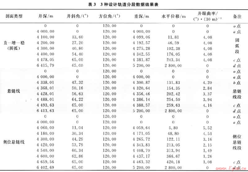 2) 依據(jù)套管內(nèi)摩擦阻力系數(shù)0.25和裸眼段內(nèi)摩擦阻力系數(shù)0.30,可計算出在平均摩擦阻力系數(shù)0.28條件下穩(wěn)斜段對應(yīng)的臨界穩(wěn)斜角αk=74.36°>αcmax=65.O0°,滿足滑動定向鉆進(jìn)要求,可確定出3種設(shè)計軌道穩(wěn)斜段對應(yīng)的合理穩(wěn)斜角為65.00°。