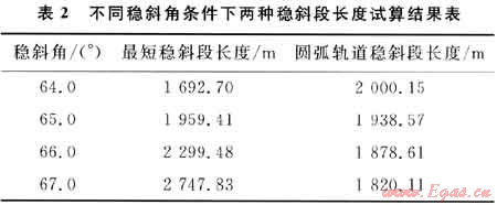 通過簡化式可試算出最大穩(wěn)斜角,即假設(shè)一個穩(wěn)斜角αc,對應(yīng)算出一個穩(wěn)斜段長度Lw,然后與設(shè)計井在該穩(wěn)斜角下確定的圓弧軌道穩(wěn)斜段對比結(jié)果見表2,確定出最大穩(wěn)斜角αcmax=65.00°。
