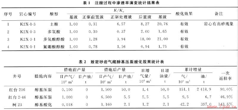 實驗選用K2X井巖心,酸化效果實驗結果見表1。巖心酸化流動效果評價實驗結果表明:采用加入醇類的多氫酸酸液體系處理巖心后,其最終滲透率為基準滲透率的3~5倍,取得了很好的滲透率增幅效果。