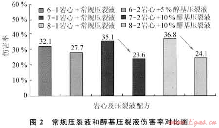 室內對研制的醇基壓裂液性能進行實驗評價,結果表明:①醇基壓裂液的表面張力低于26mN/m,低于水基壓裂液;②防膨率在80%以上,優(yōu)于水基壓裂液;③殘渣含量為462mg/L,低于550mg/L的行業(yè)標準;④用K2X井巖心實驗醇基壓裂液的傷害率在23.65%~27.7%之間,而水基壓裂液的傷害率在32.1%~36.8%之間,可見醇基壓裂液傷害率比常規(guī)壓裂液降低幅度約1/3(圖2);⑤甲醇的加入有利于降低壓裂液的表面張力和黏度,從而有利于壓裂液施后的返排,降低了壓裂液對儲層的傷害。