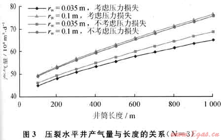 圖3為不同井筒半徑下,產(chǎn)氣量隨井筒長(zhǎng)度的變化關(guān)系??梢钥闯觯壕查L(zhǎng)度相同時(shí),井筒半徑越小,對(duì)產(chǎn)能的影響也越大,影響的幅度也越明顯;當(dāng)井筒半徑大到一定的值后,井筒內(nèi)壓力損失所造成的產(chǎn)量降低將不再明顯。在相同井筒半徑和裂縫條數(shù)下,壓裂水平井的產(chǎn)量不與水平段的長(zhǎng)度成正比,當(dāng)水平段長(zhǎng)度達(dá)到一定的值后,產(chǎn)量的增加將變得緩慢。