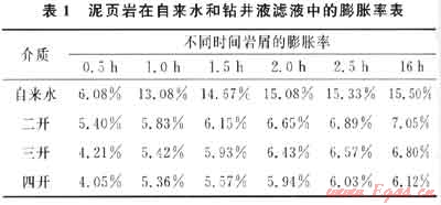 將群6井失穩(wěn)井段(4400~4500m)泥頁(yè)巖巖屑樣品烘干后粉碎成粉末,用100目分樣篩過篩,收集100目篩下的巖屑粉末。取該粉末10.0g于頁(yè)巖膨脹性測(cè)定儀的樣品筒中,在4.1MPa壓力下壓5min,然后放入頁(yè)巖膨脹性測(cè)定儀中,在室溫條件下,測(cè)定樣品在自來水和鉆井液濾液中的浸泡不同時(shí)間后巖心的總高度及巖心的膨脹率。室內(nèi)模擬配制了第二次開鉆(以下簡(jiǎn)稱二開)、第三次開鉆(以下簡(jiǎn)稱三開)及第四次開鉆(以下簡(jiǎn)稱四開)鉆井液體系,配方采用現(xiàn)場(chǎng)配方。實(shí)驗(yàn)結(jié)果如表1所示。