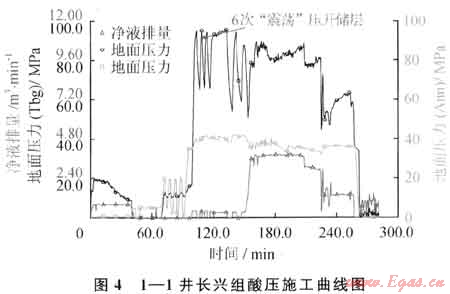 針對元壩氣田區(qū)塊儲層埋藏深、破裂壓力梯度較高的特點(diǎn),通過在注入前置酸之前采用高密度(1.8~2.0g/cm3)加重酸液來提高液柱壓力,實(shí)現(xiàn)在井口施工限壓下增加井底凈壓力,以增大壓開儲層的幾率。1-1井采用密度1.8g/cm3加重酸,創(chuàng)造了井底壓力最高(212MPa)的液體加重最高的世界紀(jì)錄。