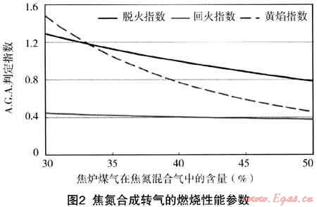 根據(jù)美國燃?xì)鈪f(xié)會A.G.A.36#公告中公布的關(guān)于燃?xì)饣Q性預(yù)測的方法[2~4],利用“I”指數(shù)法,對焦氮混合氣替代高焦合成轉(zhuǎn)氣時的脫火指數(shù)、回火指數(shù)和黃焰指數(shù)進(jìn)行了計算,其結(jié)果如圖2所示。