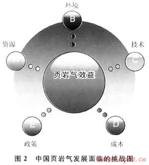 四川盆地長寧、威遠地區(qū)已鉆井壓裂后均獲氣,表明四川盆地長寧和威遠地區(qū)存在豐富的頁巖氣,初步回答了四川盆地有無頁巖氣的問題。但是資源前景、單井產(chǎn)量、氣藏規(guī)模、投資效益等問題仍需艱苦探索。而要解決這些問題,則面臨著資源、環(huán)境、技術(shù)、成本和政策等5個方面的挑戰(zhàn)(圖2)。