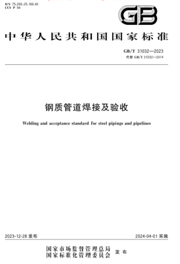 鋼制管道焊接及驗收國標/T 31032-2023 摘 要 鋼制管道焊接及驗收GB/T 31032-2023 《鋼制管道焊接及驗收》GB/T 31032-2023標準于2023年12月28日發(fā)布,將于2024年4月1日起實施,本文件代替 GB/T 31032-2014《鋼質(zhì)管道焊接及驗收》,與GB/T31032-2014相比,除結(jié)構(gòu)調(diào)整和編輯性改動外,主要技術(shù)變化如下: a)更改了適用范圍,將適用介質(zhì)中的“燃氣”改為“天然氣”,將適用范圍“輸送管線、管網(wǎng)、閥室和站場”改為“長輸管道、集輸管道”,刪除了“氣焊”焊接方法,增加了X射線數(shù)字成像檢測、X射線計算機輔助成像檢測等驗收要求(見第1章,2014年版的第1章); b)刪除了“業(yè)主”“承包商”“根焊”“返修”“焊縫”“顯示”“合格焊工”“焊工考試”“焊接工藝評定”的術(shù)語和定義(見2014年版的3.1、3.2、3.5、3.9、3.12、3.16、3.18、3.19、3.21); c)增加了“焊接工藝評定報告”“自動焊”“根焊道”“背面焊”“返修焊”“全壁厚返修”“部分壁厚返修”“背面內(nèi)返修”“二次返修”“修補”“焊接熱輸人”“預(yù)熱溫度”“道間溫度”“焊后熱處理”“空心焊道”“回火焊道”“堆焊修復(fù)”的術(shù)語和定義(見 3.2、3.5、3.10、3.11、3.15~3.24、3.28~3.30); d)更改了“預(yù)焊接工藝規(guī)程”“焊接工藝規(guī)程”“機動焊”“旋轉(zhuǎn)焊”“固定焊”“缺陷”“內(nèi)凹”術(shù)語的定義(見 3.1、3.3、3.4、3.7、3.8、3.26、3.27,2014年版的 3.20、3.22、3.3、3.10、3.11、3.15、3.17); e)增加了縮略語(見第4章); f)增加了人員、焊接工藝、焊接環(huán)境的內(nèi)容(見第5章); g)更改了對管材及管件的具體要求(見5.2.1,2014年版的4.2.1): h)更改了填充材料類型和規(guī)格(見5.2.2.1,2014年版的4.2.2.1); i)更改了焊接工藝評定基本要素,增加了夏比沖擊韌性試驗、宏觀金相試驗、拉伸試驗、背彎和面彎試驗、側(cè)彎試驗、SSC 試驗、HIC試驗、CTOD試驗、硬度試驗的方法及要求等內(nèi)容(見第6章,2014年版的第5章): j)更改了上崗考試方法、單一考試適用壁厚范圍,增加了支管連接單一考試技術(shù)要求等內(nèi)容(見第7章,2014年版的第6章): k)更改了管口組對錯邊量要求、焊縫外觀檢查尺寸要求,增加了不等壁厚對接焊口坡口形式、對口器使用要求等內(nèi)容(見第8章,2014年版的第7章); l)更改了無損檢測人員要求,增加了X射線數(shù)字成像檢測、X射線計算機輔助成像檢測、相控陣超聲檢測、全自動超聲檢測等方法(見第9章,2014年版的第8章); m)增加了X射線數(shù)字成像檢測、X射線計算機輔助成像檢測、相控陣超聲檢測、全自動超聲檢測等評定要求,更改了射線檢測氣孔、磁粉檢測圓形缺陷、滲透檢測圓形缺陷、超聲檢測體積缺陷評判指標等內(nèi)容(見第10章,2014年版的第9章); n)增加了返修要求、返修焊的焊接工藝評定基本要素、返修焊規(guī)程、返修焊工上崗考試等內(nèi)容(見第11章); o)增加了X射線數(shù)字成像檢測、X射線計算機輔助成像檢測、相控陣超聲檢測、全自動超聲檢測等內(nèi)容,更改了射線檢測、超聲檢測等內(nèi)容(見第12章,2014年版的第11章); p)更改了機動焊焊接工藝規(guī)程、機動焊焊接工藝評定基本要素,機動焊焊工上崗考試等內(nèi)容(見第13章,2014年版的第12章); q)更改了工程臨界評估的相應(yīng)內(nèi)容(見附錄A,2014年版的附錄C); r)更改了在役管道焊接的相應(yīng)內(nèi)容(見附錄B,2014年版的附錄D); s)更改了推薦記錄表格(見附錄C,2014年版的附錄E)。 在線下載列表 會員下載需要E點:0 群友會員無限制瀏覽 文章導(dǎo)航 贊 賞 分享 您可以選擇一種方式贊助本站 支付寶轉(zhuǎn)賬贊助 微信轉(zhuǎn)賬贊助 注解:本資料由會員及群友提供僅供閱讀交流學習,不得用于商業(yè)用途! 網(wǎng)站VIP會員無限制下載網(wǎng)站資料!贊助網(wǎng)站獲得,點擊贊助?。?/a> 城鎮(zhèn)燃氣輸配工程施工及驗收標準國 石油天然氣建設(shè)工程施工質(zhì)量驗收規(guī) 石油天然氣金屬管道焊接工藝評定石 鋼制管道焊接規(guī)程 石油天然氣標準/ < 上一篇 石油天然氣工業(yè) 管線輸送系統(tǒng)用鋼管國標/T 9711-2023 下一篇 > 《先導(dǎo)式安全閥》國標/T 28778—2023 文章導(dǎo)航